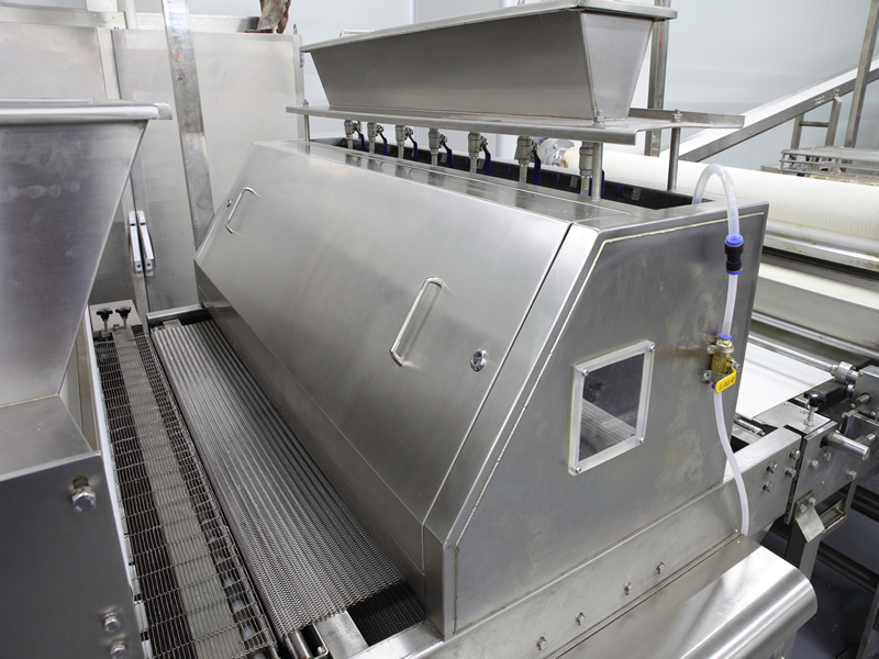 該設備應用于將固體顆粒或者粉狀調味料,鹽,糖,芝麻及果仁片等撒布在面皮或則餅干上?;厥諜C回收多余的撒布物料循環利用。