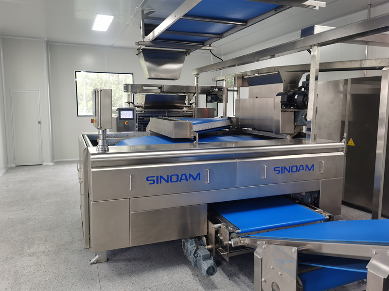 配合喂料機將軋薄的面皮切片并依次疊加至8~16層,并輸送至成型軋輥,該機能將回面始終處于面皮底部,經切片式疊層機生產出來的餅干層次感強、口感松脆、酥化程度極高,配合機器上的撒酥機,可生產蘇打餅干和其它高檔餅干。